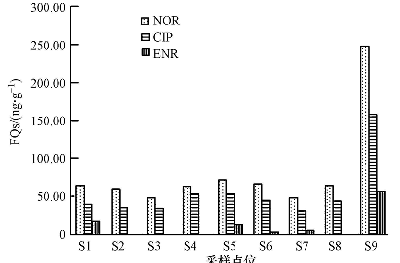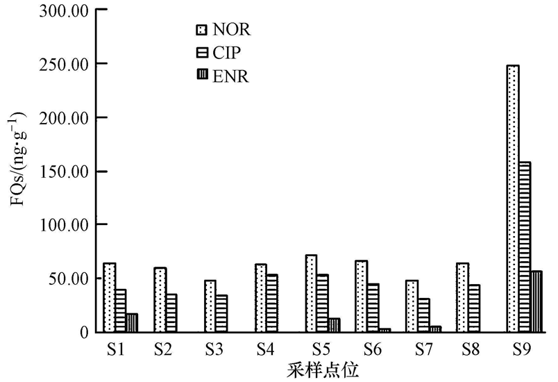 從圖 1可見,9個采樣點(diǎn)均可檢測到NOR和CIP,S2、S3、S4、S8均未檢測到ENR.各樣點(diǎn)FQs含量均為NOR>CIP>ENR.S9的FQs含量最高,NOR含量最高為248.25 ng · g-1,CIP最高為158.69 ng · g-1,ENR最高為56.81 ng · g-1.