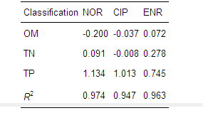對NOR、CIP及NOR含量與OM、TN、TP進(jìn)行多元線性回歸分析(見表 2),sig均小于0.001,R2在0.947~0.974間,回歸方程有效,回歸模型與實驗得到的數(shù)據(jù)均吻合較好.從多元回歸分析中得出NOR、CIP及NOR含量主要取決于TP的含量(表 2).