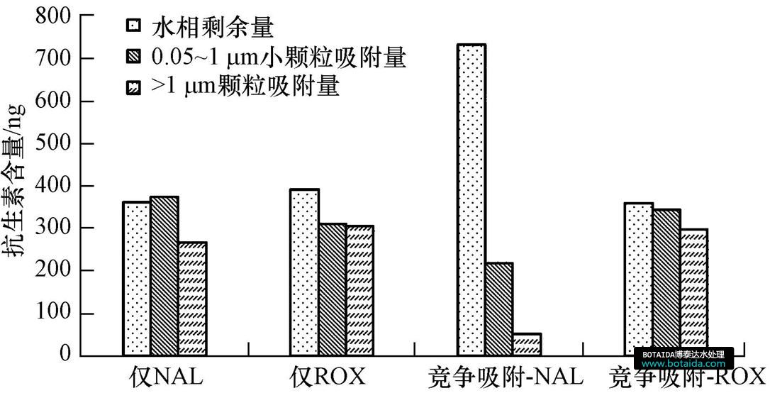 有研究發(fā)現(xiàn),不同粒徑的顆粒物在天然水體中的分布不同,對抗生素的吸附能力也不同.一方面,水體中小顆粒物(粒徑<1 μm)的百分含量較高,加之其廣大的比表面積,會大量吸附水體中殘留的抗生素,然而傳統(tǒng)飲用水處理標(biāo)準(zhǔn)中卻沒有針對小顆粒物去除效果的相關(guān)標(biāo)準(zhǔn);另一方面,粒徑越小,顆粒物越難以去除,其表面吸附的抗生素也會隨之殘留在水體中,對飲用水安全產(chǎn)生影響.基于此,本文進行了天然水體顆粒物對4種典型抗生素(羅紅霉素(ROX)、青霉素G(PG)、甲氧芐啶(TMP)、萘啶酸(NAL))的吸附平衡實驗,研究它們兩兩之間的競爭吸附特征,并分粒徑測定不同大小顆粒物上的抗生素含量,以期對飲用水水質(zhì)標(biāo)準(zhǔn)和處理工藝的改善提供借鑒.