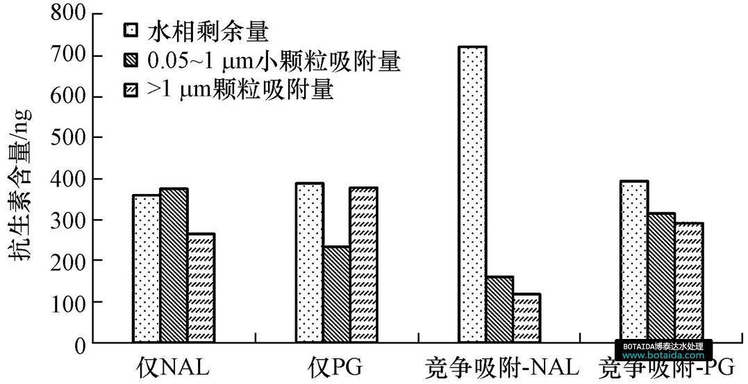 圖 1所示為萘啶酸(NAL)與青霉素G(PG)單獨存在及共同存在于水中的吸附實驗結(jié)果.通過對比水相剩余量可知,當(dāng)萘啶酸和青霉素G同時存在時,固體顆粒對青霉素G的吸附能力大于對萘啶酸的吸附能力.與抗生素單獨存在相比,萘啶酸的水相剩余量顯著增大,而青霉素G的水相剩余量則基本維持不變.可見,青霉素G的存在很大程度地抑制了顆粒對萘啶酸的吸附,但顆粒對其自身的吸附量影響甚微.這同時說明單一物質(zhì)存在時,即使吸附達到平衡,顆粒上的吸附位點卻未飽和,顆粒的吸附能力并未達到最大.