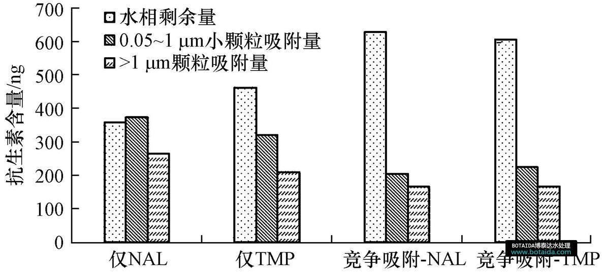 圖 3所示為萘啶酸(NAL)與甲氧芐啶(TMP)單獨存在及共同存在于水中的吸附實驗結(jié)果.對比兩種條件下抗生素的水相剩余量可知,競爭吸附達到平衡時,甲氧芐啶、萘啶酸的水相剩余量均有所增加.所以,二者在吸附過程中是相互抑制的,且甲氧芐啶對萘啶酸的抑制作用更強.這可能是因為甲氧芐啶中含有—NH2,而萘啶酸中含有—COOH,二者發(fā)生反應(yīng),相互作用后減少了吸附位點,從而降低了顆粒對二者的吸附.競爭吸附時,固體顆粒對抗生素的吸附總量增長了19.69%,明顯小于抗生素的增長量.