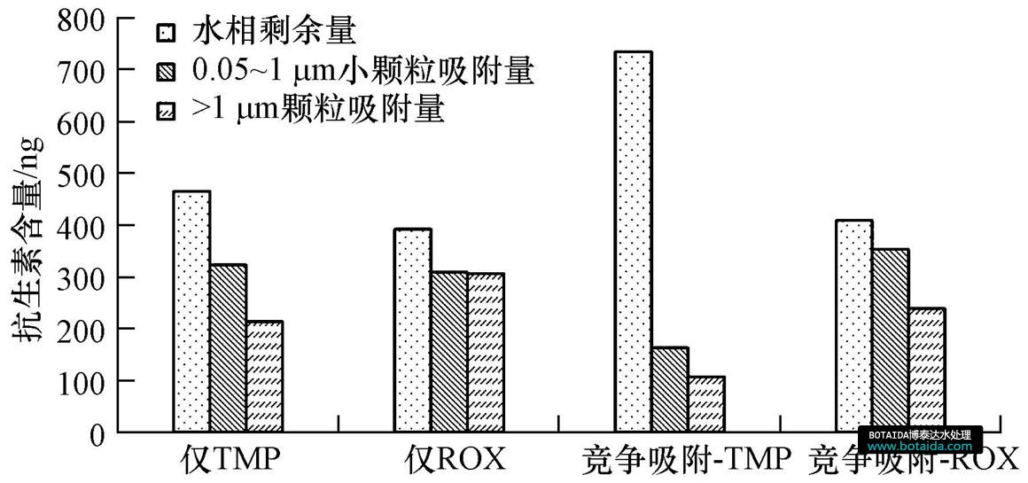 圖 4所示為甲氧芐啶(TMP)與羅紅霉素(ROX)單獨存在及共同存在于水中的吸附實驗結(jié)果.從水相剩余量角度來看,甲氧芐啶的水相剩余量大幅增加,而羅紅霉素的水相剩余量幾乎未發(fā)生變化.受羅紅霉素影響,甲氧芐啶在固液間的Kd值變小.從結(jié)構(gòu)上看,羅紅霉素屬于大環(huán)內(nèi)酯類抗生素,單位質(zhì)量的活性基團—OH、—C O較少,吸附能力較弱;而甲氧芐啶只含苯胺基和酰胺基兩個離子型官能團,在顆粒上的吸附作用也較弱.但是,羅紅霉素的分子量較大,單個分子上的活性基團較多,能占據(jù)更多的吸附位點,所以,顆粒對甲氧芐啶的吸附就相應(yīng)地受到了抑制.