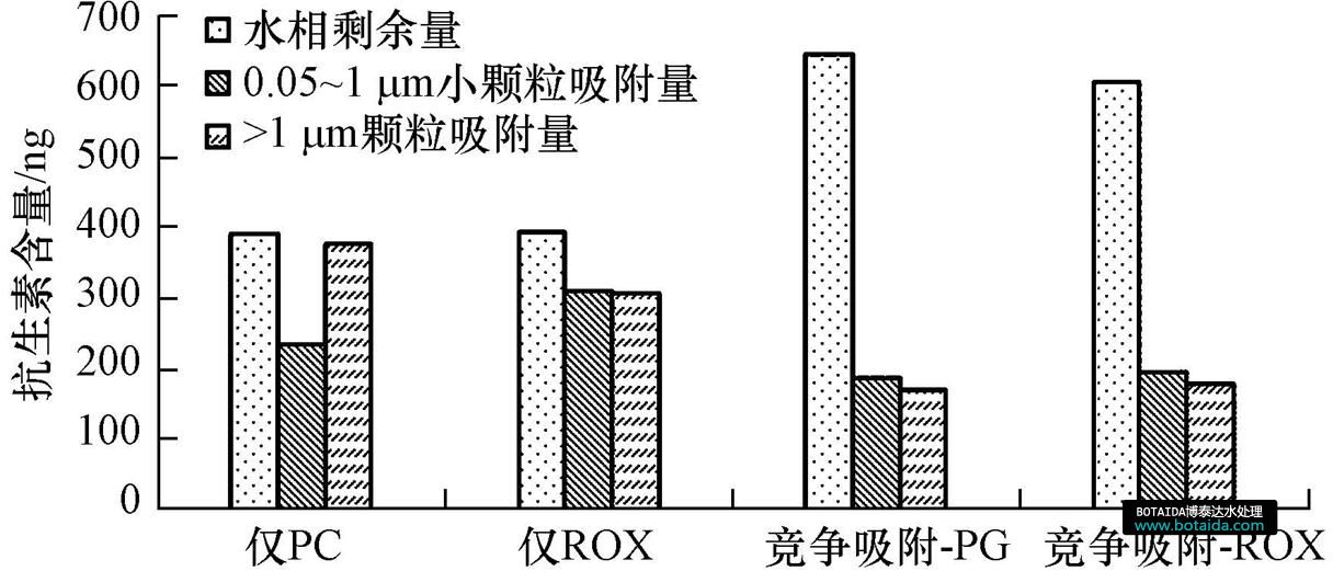 圖 6所示為青霉素G(PG)與羅紅霉素(ROX)單獨存在及共同存在于水中的吸附實驗結(jié)果.顆粒上的吸附總量有一定增加,增幅在所有6種競爭吸附中最小,這說明二者同時投加時相互抑制的現(xiàn)象比較明顯.具體到小顆粒的吸附能力及吸附量,二者降幅明顯且羅紅霉素降幅更大,競爭吸附平衡后二者吸附量相當(dāng).小顆粒吸附總量由309.20 ng上升至379.48 ng,漲幅為22.8%,依然存在吸附未達飽和的現(xiàn)象.結(jié)構(gòu)上看,二者的活性基團不同,不會造成吸附位點的競爭,而且相互之間不發(fā)生復(fù)合反應(yīng),不影響抗生素本身的組成,但可能由于羅紅霉素分子量較大,占用空間較大,因此,產(chǎn)生了二者顆粒上的吸附量均減少但總量增多的結(jié)果.