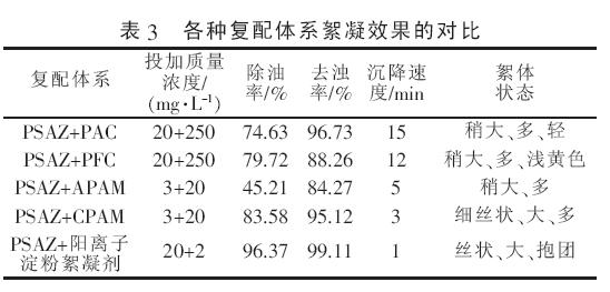 由表2 可知:6 種絮凝劑中,PAC?PFC?APAM?CPAM 對廢水中油的去除效果較差, 而PSAZ 和陽離子淀粉絮凝劑對油的去除效果相對較好?其原因是PSAZ 除了具有單元無機(jī)高分子絮凝劑的共同優(yōu)點外,其異核金屬離子的交錯排列能夠形成更長?更穩(wěn)定的分子鏈,一方面增加了其聚合度和分枝程度,使網(wǎng)捕作用加強; 另一方面金屬離子的引入增加了所帶的電荷量,使其吸附電中和能力提高,增加了其處理效果?陽離子淀粉絮凝劑的處理效果雖然次于PSAZ,但其沉淀速度是最快的,這就縮短了處理時間,提高了處理效率?各種復(fù)配體系絮凝效果的對比如表3 所示?