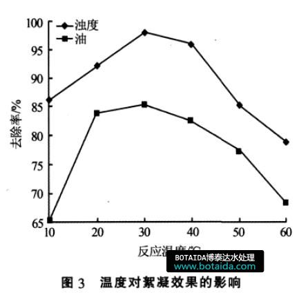 由圖3 可看出,隨著水溫的升高,絮凝效果亦相應(yīng)提高,在水溫為20~40 ℃時,其去除效果最佳;當(dāng)溫度升高到一定程度后,絮凝效果反而降低?究其原因主要是:在較低溫度時,水解反應(yīng)速度緩慢,水的黏度較大,導(dǎo)致膠體顆粒運動的阻力增大,絮體的生成速度降低,顆粒不易沉降?但水溫過高時,化學(xué)反應(yīng)速度亦加快,所形成之絮體較細(xì)小,同時絮體的水合作用增加,減緩了絮體的沉降速度,使絮凝效果降低?本試驗中室溫在25 ℃左右時,其處理效果最佳?