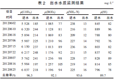 系統(tǒng)經(jīng)過(guò)2個(gè)月調(diào)試后,各項(xiàng)測(cè)試指標(biāo)均達(dá)到污水處理廠(chǎng)的接管標(biāo)準(zhǔn)。運(yùn)行結(jié)果表明,該系統(tǒng)運(yùn)行穩(wěn)定,抗沖擊負(fù)荷能力強(qiáng)。環(huán)保部門(mén)抽檢及企業(yè)自檢結(jié)果顯示,廢水各項(xiàng)指標(biāo)均穩(wěn)定達(dá)標(biāo)。近期運(yùn)行數(shù)據(jù)見(jiàn)表2。由表2 可見(jiàn),廢水經(jīng)過(guò)“預(yù)處理-UASB-二級(jí)接觸氧化”工藝處理后,平均去除效率分別為CODCr96.3%,BOD5 92.1%,NH3-N 93.6%,SS 89.7%,出水監(jiān)測(cè)指標(biāo)均優(yōu)于接管標(biāo)準(zhǔn)。