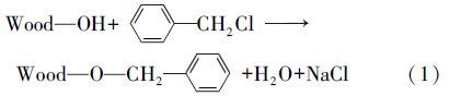 參照文獻(xiàn)(王東華等,2000)方法,在帶有攪拌機(jī)、溫度計(jì)和回流裝置的250 mL三口燒瓶中,加入20.0 g脫脂杉木粉和10% NaOH水溶液80~120 mL,攪拌均勻后讓其潤(rùn)脹 30 min,然后加入 80~120 mL氯化芐和80 mL甲苯,攪拌下于110 ℃ 油浴中加熱反應(yīng)到設(shè)定時(shí)間,冷卻并加入少量水,抽濾,分別用50 mL 50%乙醇洗滌兩次,100 mL水洗滌兩次,再用50 mL 95%乙醇洗滌兩次,抽干,在60 ℃下干燥至恒重,得芐基化杉木粉,簡(jiǎn)稱“芐基化木粉”,轉(zhuǎn)入干燥器中,并計(jì)算增重百分率(WPG).木粉芐基化改性的化學(xué)反應(yīng)式如下: