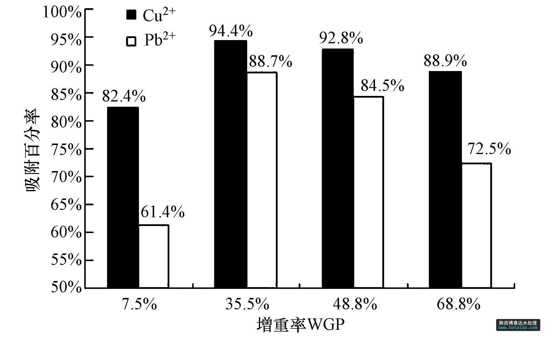 圖7 芐基化木粉的增重率對(duì)Cu2+和Pb2+吸附百分率的影響