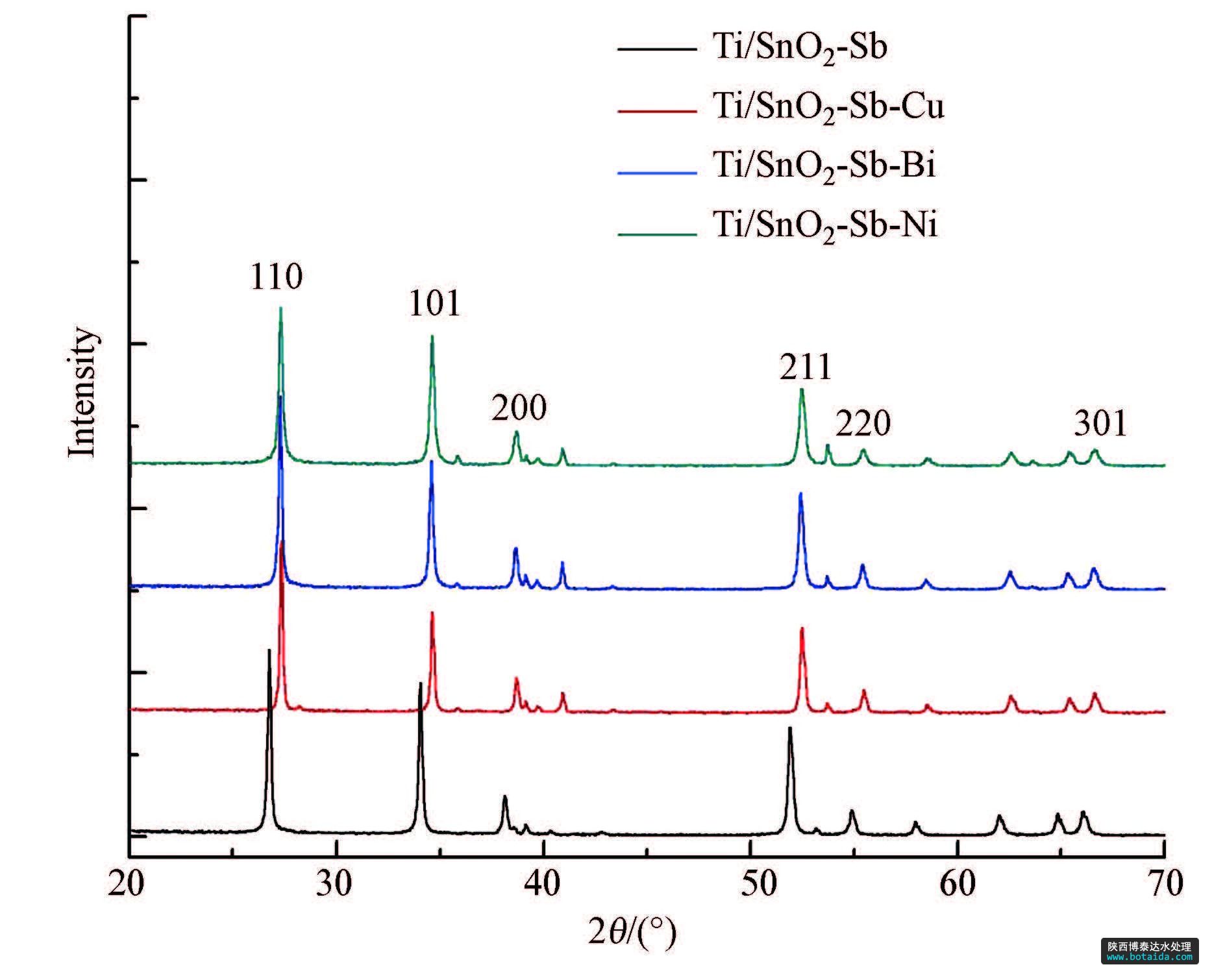 對所制備電極進行XRD分析.從圖 2數(shù)據(jù)可見,所有電極的X衍射峰的位置跟四方形金紅石型的SnO2晶體結(jié)構(gòu)的標準卡片(00-041-1445)的峰數(shù)據(jù)基本一致,并未檢測到Sb及摻雜金屬相應(yīng)氧化物的衍射峰,表明金屬摻雜并沒有改變SnO2晶體結(jié)構(gòu).這可能是因為金屬離子進入SnO2的晶格中取代了晶格中Sn4+的部分位置(李子榮和張雪梅,2006),以金屬氧化物的形式固溶到SnO2的晶格中,因而在XRD中Sb及摻雜的金屬沒有以單獨的氧化物形式存在.但是摻雜金屬后電極的X射線衍射峰位置發(fā)生了微小偏移,主要由于金屬離子與被替代的Sn4+之間離子半徑存在差異,以及金屬離子加入后出現(xiàn)的氧空穴而造成晶格缺陷.