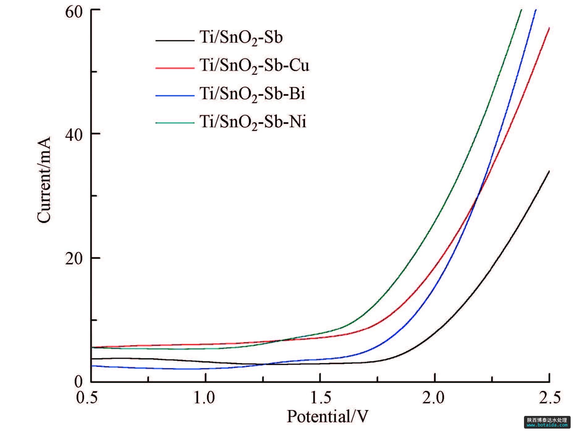電極的析氧電位是影響有機物電化學(xué)降解效率的重要因素,有機物在陽極發(fā)生氧化的同時,伴隨著析氧副反應(yīng).析氧反應(yīng)的發(fā)生主要是因為電極表面吸附的· OH和轉(zhuǎn)移到晶格內(nèi)的O不穩(wěn)定,除了可與有機物發(fā)生反應(yīng)外,還可能以O(shè)2的形式釋放(李善評等,2008).當(dāng)析氧電位低時,通過的電流大部分用于氧氣的析出,導(dǎo)致有機物降解效率降低;當(dāng)析氧電位高時,氧氣難于析出,有機物在陽極直接被氧化降解的概率就會增加.因此,較高的析氧電位是催化電極的一個重要指標.