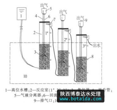 試驗裝置如圖 1 所示 ,MICR 由 3 根 D 80 mm× 1 000 mm 的有機玻璃管串聯(lián)而成,總有效容積為 12.81 L,分為 1#、2#、3# 反應室。各反應室均設 3 個孔徑為 8 mm 的取樣口,取樣口分別位于距離 反應室底部 100、350、700 mm 處,并用恒溫水浴槽控制試驗溫度為(35±1 ) ℃。 廢水從高位槽向 1# 反應室底部注入,然后由上部出水口經溢流堰順管道進入 2# 反應室底部,依次推進,經過 3# 反應室之后排出 。各反應室的氣體在集氣罩下方匯集,以泥水混合液的形式經提升管進入氣液分離器,氣體從排氣口排出,泥水混合液經回流管回流至反應室底部,形成液體內部循環(huán) 。