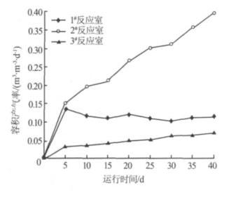 由圖 6 可見,2# 反應室產生的 CH4 最多,容積產氣率 >0.153 m3/(m3· d),最高達 0.397 m3/(m3· d),并隨著容積負荷的 增加而增大 ( 隨運行時間延長容積負荷增加 ),表明 2# 反應室以產甲烷菌為主。 1# 反應室產生的 CH4 量受進水容積負 荷的影響不大 ,總體保持在 0.103~ 0.137 m3/(m3· d) 的水平 ,表明 1# 反應室主要起水解和酸化作用 ,以產酸菌為主,產甲烷菌的活性受到抑制 ,而且受進水容積負荷的直接沖擊,CH4 產量呈現(xiàn)小幅度的波動 。 3# 反應室與 2# 反應室一樣 ,產 CH4 量隨著容積負荷的增加而增大 ,但 產 CH4 量 始 終 很 低 ,其 容 積 產 氣 率 最 大 為 0.071 m3/(m3· d),表明 3# 反應室也以產甲烷菌為主 ,但由于廢水流至 3# 反應室時剩余的有機物很少 ,底物不足,因此 CH4 量很少 。