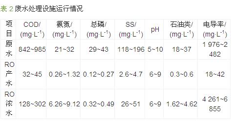 脫脂廢水、磷化廢水、噴漆廢水和電泳廢水等機械加工廢水的有機物濃度較高,且含有礦物油、懸浮物和氮磷等污染物。通過氣浮和混凝沉淀處理可將COD降低到700 mg/L左右,生物系統(tǒng)(缺氧和好氧工藝)可將COD降低到70 mg/L左右,出水可穩(wěn)定達(dá)標(biāo)排放。實際運行時首先投加NaOH將廢水pH調(diào)至8.5~9.0,然后按照3、5、1.0 mL/L的投加量分別加入5%(質(zhì)量分?jǐn)?shù),下同)的CaCl2溶液、10%的聚合氯化鋁和5%的聚丙烯酰胺溶液,混合反應(yīng)60 min后進(jìn)入氣浮池,氣浮出水按6、1.5 mL/L投加量分別投加10%的聚合氯化鋁和5%的聚丙烯酰胺溶液,混凝沉淀出水最后進(jìn)入生物處理系統(tǒng),生化出水經(jīng)砂濾器、炭濾器、超濾、保安過濾器和反滲透深度處理后回用于生產(chǎn),反滲透濃水可達(dá)到GB 8978—1996三級標(biāo)準(zhǔn)。該工程已穩(wěn)定運行4 a多,從實際檢測結(jié)果來看,反滲透產(chǎn)水COD穩(wěn)定在32~45 mg/L,電導(dǎo)率穩(wěn)定在18~42 μS/cm,可滿足生產(chǎn)用水水質(zhì)要求;反滲透濃水COD穩(wěn)定在128~302 mg/L,SS穩(wěn)定在26~51 mg/L,達(dá)到GB 8978—1996三級標(biāo)準(zhǔn)后達(dá)標(biāo)排放,其主要水質(zhì)指標(biāo)如表 2所示。