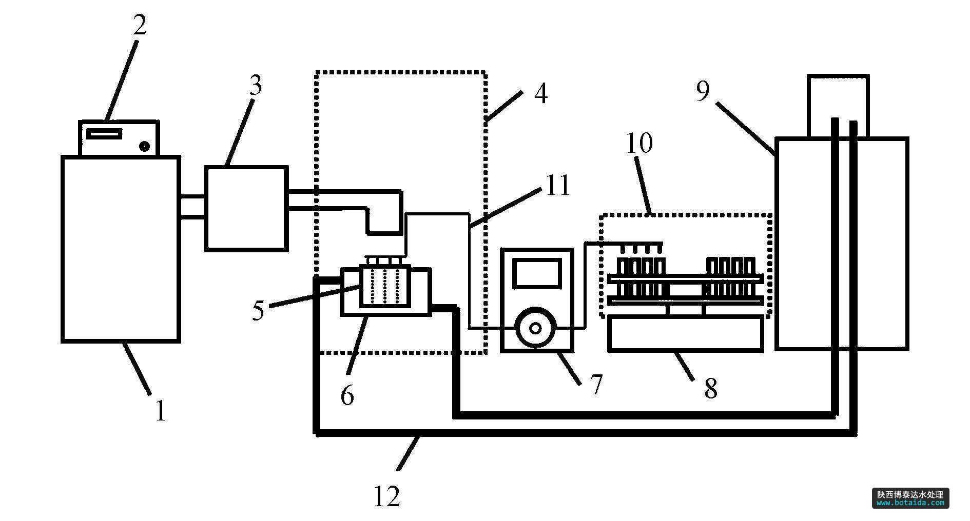 圖1 單線態(tài)氧捕獲裝置示意圖(1.光源,2.光強調(diào)節(jié)器,3.單色儀,4.暗室,5.多通量反應杯,6.冷阱,7.恒流泵,8.部分收集器,9.恒溫循環(huán)水,10.遮光罩,11.采樣管路,12冷凝水管路)
