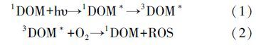 溶解性有機質(zhì)(DOM)含有發(fā)色基團,是重要的天然光敏劑,在紫外輻射或太陽光照射下,單線態(tài)(state DOM singlet,1DOM)分子吸收光能先轉(zhuǎn)化為激發(fā)單線態(tài)(excited state DOM singlet,1DOM*),進而轉(zhuǎn)化為激發(fā)三線態(tài)(excited state DOM triplets,3DOM*),進一步與溶解氧分子發(fā)生一系列反應,產(chǎn)生活性氧物質(zhì)(reactive oxygen species,ROS),如羥基自由基(hydroxyl radical,· OH)、單線態(tài)氧(singlet oxygen,1O2)、超氧化物(superoxide,O2-)等(見反應式(1)、(2.這些活性氧物質(zhì)可以誘導有機污染物光降解,同時,DOM也會與目標化合物競爭光吸收,或猝滅目標化合物的激發(fā)態(tài),DOM對有機污染物的光解具有光敏化和光屏蔽雙重作用(Chen et al., 2009;,這與DOM的來源、組成、化學結(jié)構(gòu)等特點密切相關.因此,溶解性有機質(zhì)在水生生態(tài)系統(tǒng)光化學中扮演重要角色,可以影響有機污染物的環(huán)境行為和生態(tài)風險.