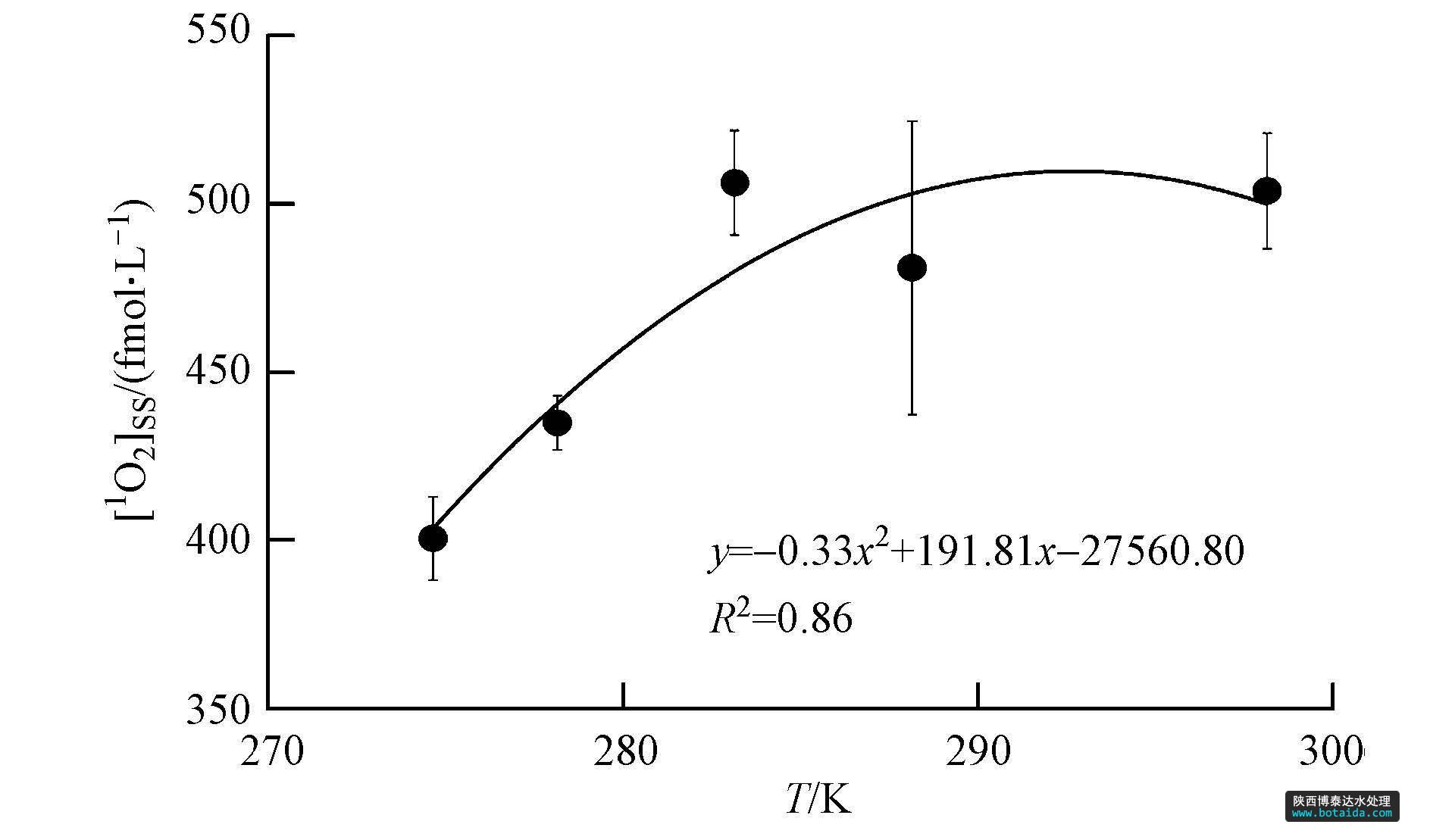 為模擬實際水環(huán)境,本研究所選溫度段為1.5、5、10、15和25 ℃,[1O2]ss與T(T為絕對溫度)的關系如圖 4所示.實驗溫度范圍內(nèi),[1O2]ss值為400~506 fmol · L-1,隨T增大呈增長趨勢.分析推測溫度升高,溶液中分子活躍度增強,使得HA吸收光子能量發(fā)生能級躍遷生成三線激發(fā)態(tài)(3HA*)的速率增大,使得更多的氧分子獲得3HA*轉(zhuǎn)移的能量形成1O2.