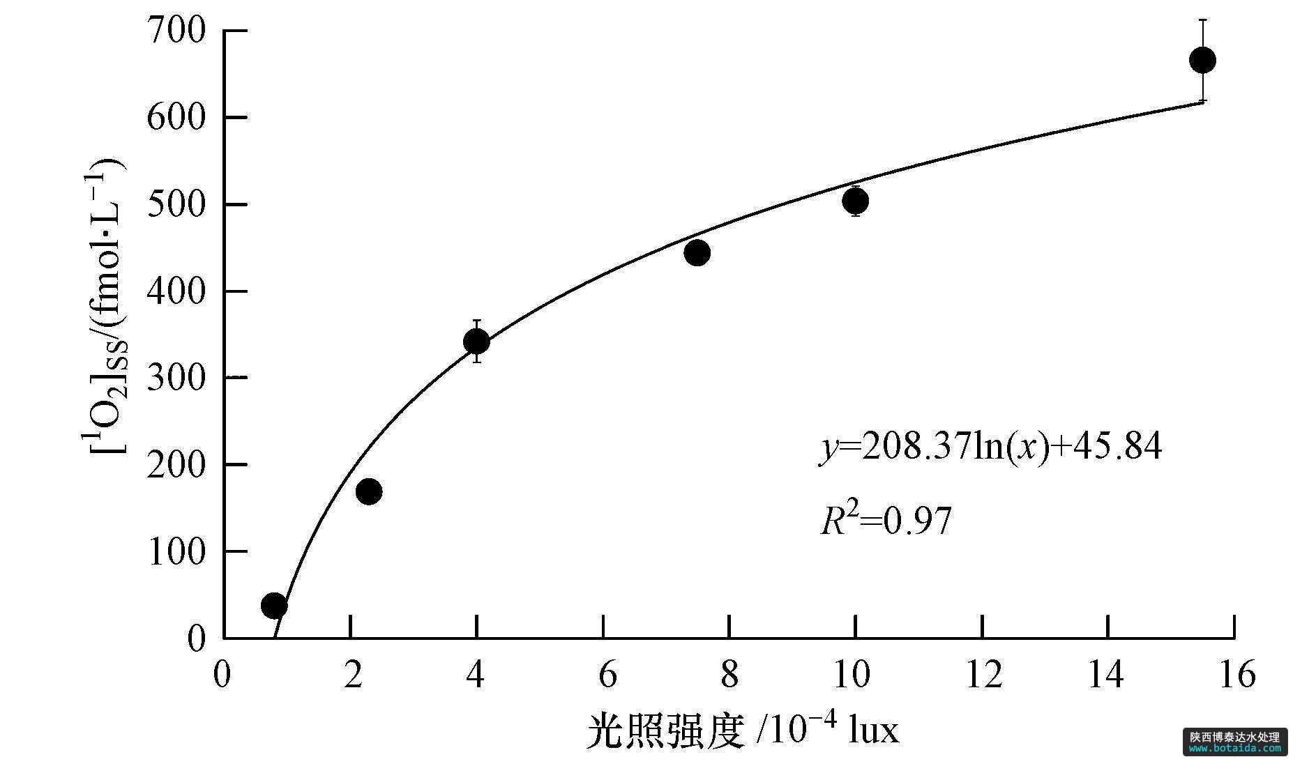 自然界直射的光照強度范圍為3.2×104到10×104 lux,本研究在此基礎上盡量模擬不同強度的太陽光,同時設置了光源光照強度最大值,評估光源的最大潛力.圖 5 為不同光照強度(0.8、2.3、4、7.5、10、15.5 ×104 lux)下,腐殖酸產(chǎn)生的[1O2]ss值.光強為15.5×104 lux時,[1O2]ss值達到666.1 fmol · L-1,隨著光強減弱,1O2產(chǎn)生速率降低,在0.8×104 lux光照下,單線態(tài)氧產(chǎn)生速率k與最大光強時相比低1個數(shù)量級,[1O2]ss值僅為37.3 fmol · L-1.DOM產(chǎn)生1O2是一個能量轉(zhuǎn)移的過程,且更依賴于365 nm左右處的紫外光子能量(Vinoe et al., 2010; Dalrymple et al., 2010).本研究中采用氙燈模擬300~800 nm波段日光輻射,365 nm處能量本身較弱,光照強度降低,使得供腐殖酸吸收的光子減少,減弱了光敏化反應.