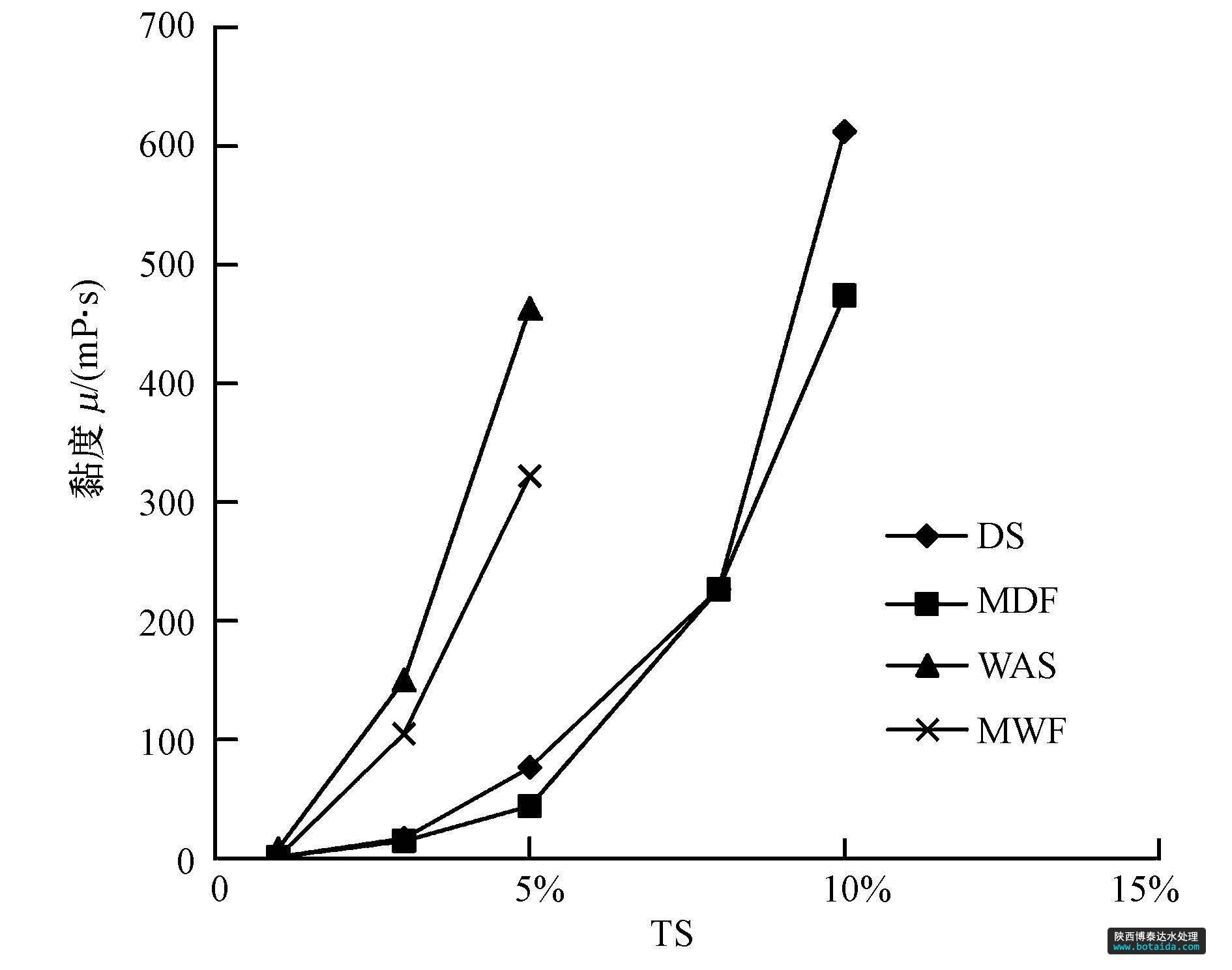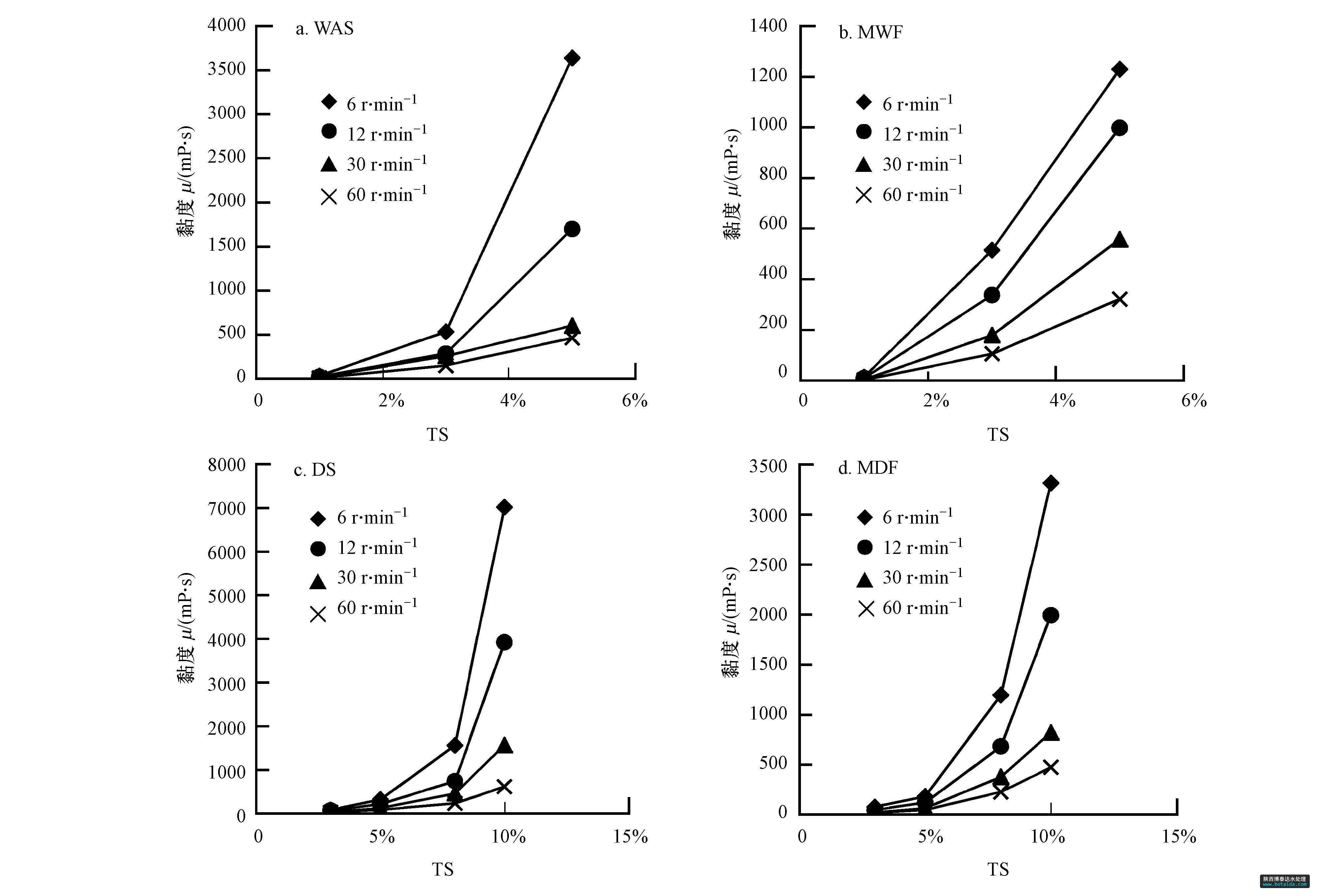 由圖 2可以看出在60 r · min-1剪切速度下添加餐廚垃圾后的MWF和MDF的黏度較相應(yīng)的純泥而言都有所降低,一方面可能是由于餐廚垃圾的含水率較原泥的含水率低,在配制混合液時(shí)會(huì)加入更多的水稀釋,從而導(dǎo)致黏度的降低;另一方面通過(guò)對(duì)TS為3%、5%、8%濃度的餐廚垃圾進(jìn)行黏度的測(cè)量,發(fā)現(xiàn)黏度值均在50 mPa · s以下,因此推測(cè)將一種很低黏度的流體混入相對(duì)較高黏度流體后,可能會(huì)使得混合液黏度變小.在TS為5%時(shí),DS和MDF的黏度明顯小于WAS和MWF.本課題組前期試驗(yàn)結(jié)果顯示,在TS為5%濃度下分別對(duì)MWF和MDF進(jìn)行聯(lián)合厭氧發(fā)酵實(shí)驗(yàn),MDF與MWF混合厭氧發(fā)酵平均日產(chǎn)氣量分別為411.5 mL · L-1 · d-1、256.2 mL · L-1 · d-1,MDF厭氧發(fā)酵日產(chǎn)氣量是MWF的1.6倍.MDF比MWF的產(chǎn)氣性能好,這可能跟MDF的黏度較低,便于物料與反應(yīng)器中基質(zhì)和微生物混合有關(guān).由圖 2還可以看出,DS和MDF的黏度在TS=1%到TS=8%的濃度區(qū)間內(nèi)變化較為緩慢,但當(dāng)TS從8%增長(zhǎng)到10%時(shí),物料的黏度急劇增大,因此對(duì)于高濃度物料的消化系統(tǒng)而言,如果物料不進(jìn)行預(yù)處理,TS=8%是一個(gè)較為利于厭氧消化的濃度條件.