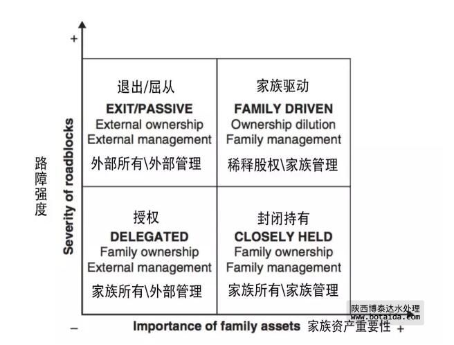 家族企業(yè)路線圖為家族可以選擇的路線提供了一個非常簡明的圖解。通常,它能做出如下預(yù)測:家族資產(chǎn)漸趨減少的企業(yè)應(yīng)該更多地尋求外部管理的介入,而目前以及未來面臨重大障礙的企業(yè),則應(yīng)該積極尋求所有權(quán)結(jié)構(gòu)的改革,以便將障礙可能造成的損失減小到最低。