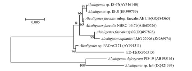 經(jīng)測序,獲得片段長度為1463 bp的部分16S rRNA基因序列,GenBank登錄號(hào)為JX966315. 在NCBI數(shù)據(jù)庫的比對(duì)結(jié)果表明,該菌株與Alicaligenes sp.的相似性達(dá)98%以上,推測其為Alicaligenes sp. 選擇序列相關(guān)性較高的76個(gè)16S rRNA序列,用Cluxtal X序列分析軟件分析其與ED-12的序列同源可靠性,選9個(gè)可信度較高的序列用MEGA 4.0軟件通過N-J法構(gòu)建系統(tǒng)發(fā)育樹,確定ED-12的進(jìn)化地位,結(jié)果如圖 1所示.