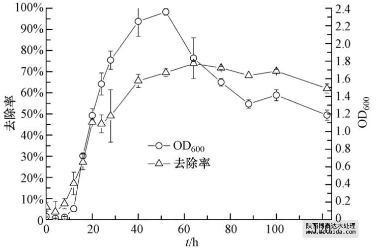 由此可知,聚磷菌ED-12菌株能夠在以NH4Cl、NaNO3、NaNO2、(NH4)2SO4、蛋白胨和NH4NO3為唯一氮源的培養(yǎng)基中生長.根據(jù)微生物生長量、生長周期及對(duì)PO3-4-P的去除率,NH4Cl是菌株ED-12生長及發(fā)揮除磷能力的最佳氮源.