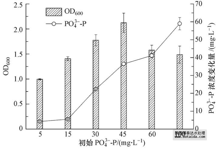 聚磷菌對(duì)磷的去除包括兩條途徑:生長利用和異染顆粒貯磷.根據(jù)聚磷菌分離篩選原理,過高濃度的PO3-4-P會(huì)抑制聚磷菌的生長與繁殖. 因此,考察不同起始濃度的PO3-4-P對(duì)聚磷菌生長的影響及相應(yīng)條件下聚磷菌對(duì)PO3-4-P的去除效果,對(duì)分析聚磷菌生長與聚磷過程的關(guān)系及指導(dǎo)聚磷菌在富營養(yǎng)化水體中的工程應(yīng)用有實(shí)際意義.