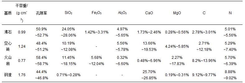 沸石、火山巖購于北京某濾料廠,沸石粒徑2~5 mm,火山巖粒徑2~10 mm.空心磚來自北京某工地,鋼渣來自南昌某鋼廠,研磨過篩后粒徑為2~5 mm.各填料均用清水清洗,并烘干備用.填料干容重與孔隙率采用標(biāo)準(zhǔn)土壤學(xué)方法測(cè)定.填料的化學(xué)組成采用X射線能譜儀測(cè)定(EX-250,HORIBA公司,日本).4種填料的理化性質(zhì)如表 1所示.