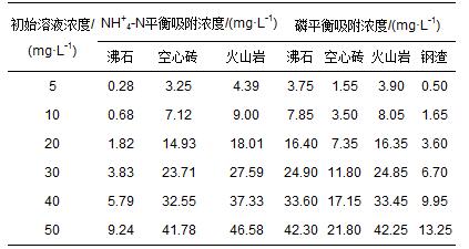單種填料對(duì)溶液中氮、磷的等溫吸附結(jié)果見表 3.由于鋼渣在前期實(shí)驗(yàn)中對(duì)NH+4-N基本無吸附,故未在表中列出.如表 3所示,填料的類型影響填料的吸附效果.隨著溶液濃度增加,填料的吸附量也迅速增大,但當(dāng)濃度增大到一定程度后,吸附作用逐漸減弱,吸附作用趨于平衡.