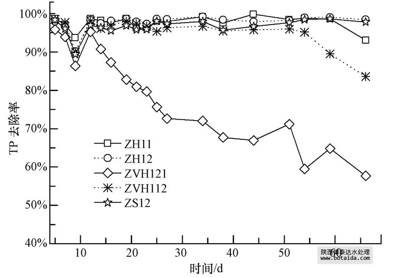 圖 6展示了反應(yīng)器運(yùn)行前70 d,各反應(yīng)器中TP去除率的情況.ZH12、ZH11、ZS12填料組合對(duì)磷一直保持著較高的去除率,而ZVH121、ZVH112填料組合在運(yùn)行期間磷去除率的降低,是因?yàn)樵谠摻M合中空心磚含量較少,在反應(yīng)器運(yùn)行一段時(shí)間后,反應(yīng)器中的空心磚對(duì)磷吸附達(dá)到飽和.含鋼渣的ZS12組合對(duì)磷的去除效果穩(wěn)定且較高,但相比較于其他污染物的去除,鋼渣并不適于在人工濕地處理含磷較低廢水的工程中應(yīng)用.而空心磚不僅能有效地去除磷,且對(duì)氮的去除無明顯負(fù)作用,適合添加到填料組合中,在不影響其它污染物去除效果的同時(shí),用于提高人工濕地中磷的去除效果.