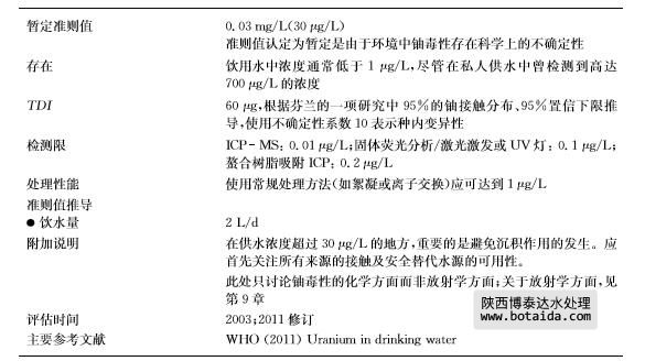 根據(jù)人群接觸高濃度鈾的新的流行病學(xué)研究推導(dǎo)的30μg /L的暫定準(zhǔn)則值,代替原先 根據(jù)實驗動物研究推導(dǎo)的暫定準(zhǔn)則值。被認(rèn)定為是基于有關(guān)鈾的毒理學(xué)和流行病學(xué)上的不 確定性以及要實現(xiàn)更低濃度供應(yīng)在技術(shù)上的困難度。要注意的是,有關(guān)人類群體的研究如 可獲取且質(zhì)優(yōu),則為用于推導(dǎo)健康準(zhǔn)則值相關(guān)信息的首選來源