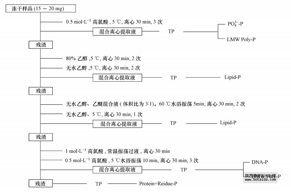 污泥和細(xì)菌細(xì)胞中不同形態(tài)磷含量的測定采用改進(jìn)的STS法,具體測量步驟見圖 1.該法將樣品中的磷分為正磷酸鹽(PO3-4-P)、低分子量聚磷酸鹽(LMW Poly-P)、磷脂(Lipid-P)、DNA磷(DNA-P)、高分子量聚磷酸鹽(HMW Poly-P)、蛋白質(zhì)磷和殘?jiān)?Protein+Residue-P).混合離心提取液中TP含量測定時采用封閉回流消解法預(yù)處理,用鉬銻抗法測定TP和PO3-4-P含量,DNA-P含量由DNA含量乘以系數(shù)9.2%計(jì)算得到(磷是DNA的特征元素,含量相對恒定),差減計(jì)算得到LMW Poly-P和HMW Poly-P含量.