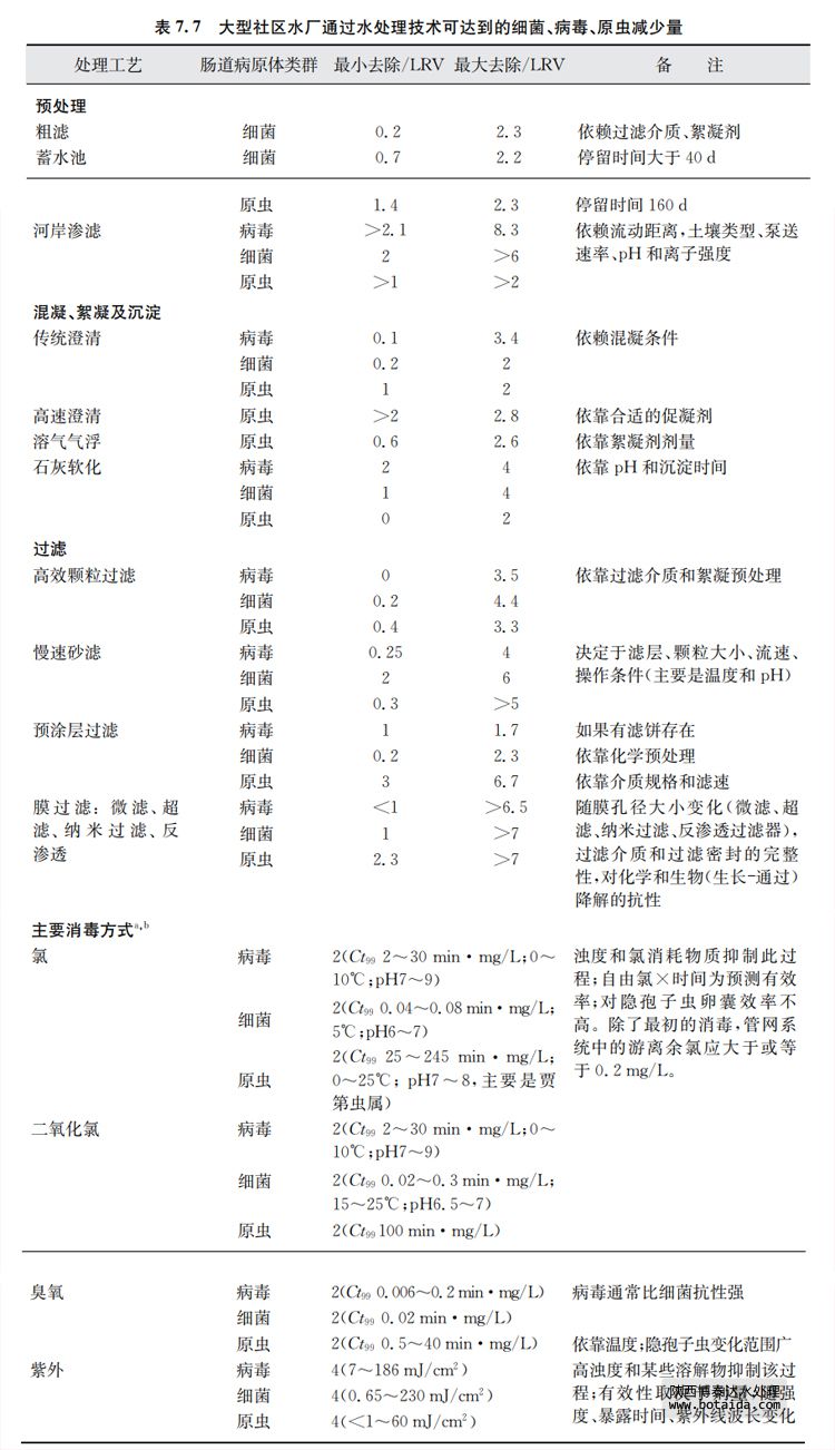 很高質(zhì)量的水,例如來自封閉含水層的地下水,可能主要依靠對水源水和配水系統(tǒng)的保護(hù) 作為主要的控制措施來保證用水安全。更常見的是實(shí)施水處理以清除或殺滅病原體。大多情 況下(如水質(zhì)差的地表水),需要對水進(jìn)行多道工序處理,如混凝、絮凝、沉淀、過濾和消毒。表 7.7對水處理工藝進(jìn)行了總結(jié),這些工藝有時(shí)單獨(dú)使用、有時(shí)聯(lián)合使用以去除微生物(也見附錄 5)。最小和最大的去除量用lg表示,它們分別在故障或者最佳處理?xiàng)l件下出現(xiàn)。