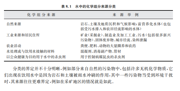 制訂每一項準(zhǔn)則值的科學(xué)依據(jù)詳見第12章。這些資料對不同國家地區(qū)依據(jù)準(zhǔn)則值制 定自己的標(biāo)準(zhǔn),或者當(dāng)污染物濃度超過準(zhǔn)則值時,評估其對健康的影響具有重要意義。 飲用水中化學(xué)污染物可以按不同方法進(jìn)行分類,其中最合適的方法是根據(jù)污染物的主 要來源進(jìn)行分類,這樣分類有助于判斷在什么地方控制這些化學(xué)物質(zhì)最為有效,有助于制訂 一套防止和減少污染的方法,這比主要依靠測定最終供水中污染物濃度更好些。