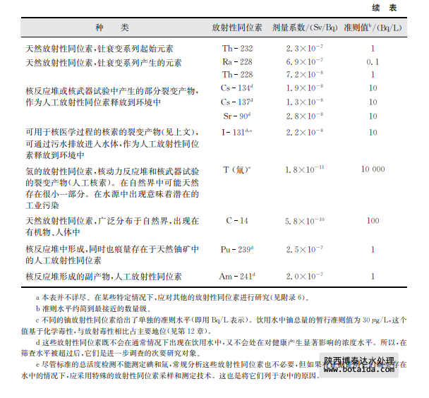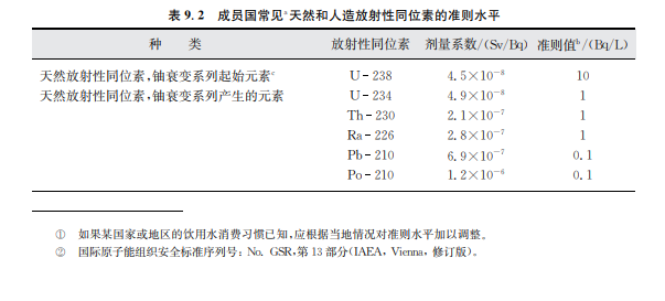 從放射學(xué)的角度,超過(guò)準(zhǔn)則值的程度也是一個(gè)需要考慮的關(guān)鍵問(wèn)題。防護(hù)電離輻射和輻 射源安全的國(guó)際基本安全標(biāo)準(zhǔn)在有關(guān)現(xiàn)有暴露的章節(jié)提到了飲用水并提出由使用飲用水帶來(lái) 的個(gè)人年最高輻射劑量最大不能超過(guò)約1mSv②。這一水平不應(yīng)被當(dāng)作“可接受的”水平或限 制性水平,并應(yīng)盡可能地采取有效措施減少受到的輻射水平。每種超過(guò)準(zhǔn)則水平的情況不同, 在做出最后的決定之前還需要考慮一些非放射方面的因素(如補(bǔ)救措施的經(jīng)濟(jì)成本、其他供水 源的實(shí)用性)。政府的有關(guān)部門(mén)應(yīng)意識(shí)到,放射性同位素(如鈾)同時(shí)具有化學(xué)毒性,那么在水 中的允許濃度可能需要以其同位素的毒性確定,而不是依據(jù)放射性(見(jiàn)第12章)。