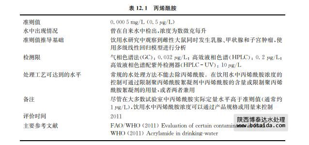 用聚丙烯酰胺絮凝劑處理飲用水時會造成丙烯酰胺單體的殘留(見表12.1)。通常,水 中該聚合物的最大允許用量為1mg/L。當(dāng)聚合物中單體的含量占0.05%時,水中相對應(yīng)的單體最大的理論濃度相當(dāng)于0.5μg/L。實(shí)際使用中,濃度可能比上述還要低2~3倍。這個 濃度適用于陰離子和非離子聚丙烯酰胺,而陽離子聚丙烯酰胺中單體的殘留水平可能會高 些。聚丙烯酰胺還可以用作建造飲用水蓄水池和水井的灌漿劑。人對其的攝入源于食物的 可能性多于源于飲用水:由于食物加工過程使用聚丙烯酰胺,而高溫烹調(diào)食物(例如面包、 油炸的和烤的食物)可能生成丙烯酰胺單體。