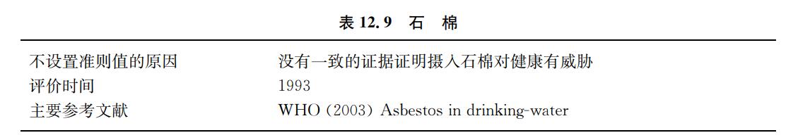 水中的石棉來(lái)自含石棉的材料和礦石在水中的分解,也來(lái)自工業(yè)排放物以及大氣污染 和供水系統(tǒng)中的石棉 水泥管道。石棉纖維從石棉 水泥管剝落可對(duì)水的供應(yīng)造成威脅。有 限的資料顯示,在淋浴或空氣潮濕時(shí),從自來(lái)水釋放到大氣的石棉暴露量可以忽略不計(jì)(見(jiàn) 表12.9)。