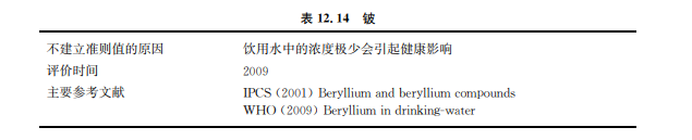水中的鈹化合物主要來源于煤礦燃燒和其他使用鈹?shù)墓I(yè)釋放。地表水中鈹?shù)钠渌麃?源包括大氣中鈹?shù)某练e和含有鈹?shù)膸r石和土壤的風(fēng)化作用。鈹在自然水體中大多數(shù)情況都 在痕量水平(見表12.14)。鈹氧化物及氫氧化物在正常pH值范圍內(nèi)難溶于水.