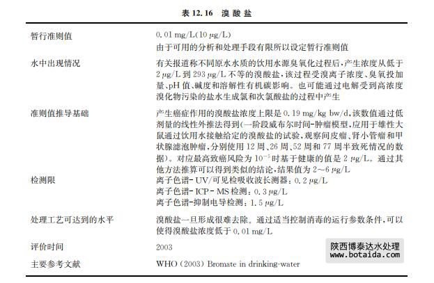 溴酸鈉和溴酸鉀是強氧化劑,主要用于燙發(fā)中和劑和硫化染料紡織品的染色。雖然 JECFA已經(jīng)做出規(guī)定(見表12.16),在食品加工中不宜使用溴酸鉀,它還是被用作氧化劑來對研磨中的面粉催熟,也用于啤酒制造處理大麥以及用于魚醬產(chǎn)品生產(chǎn)。溴酸鹽在水中通 常不存在,但可能存在于工業(yè)污染源中。有時來自于土壤污染。不過,其主要的來源是當(dāng)水 中含溴離子時,飲用水的臭氧化過程中形成溴酸鹽。電解含溴化物的鹽時,也可能在次氯酸 鹽溶液中生成溴酸鹽。