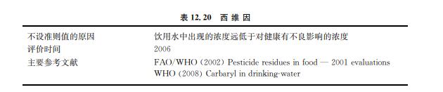 西維因(CASNo.63 25 2)是一種用于控制農(nóng)作物、樹木和觀賞植物害蟲的廣譜氨基 甲酸酯類殺蟲劑,它在公共衛(wèi)生和獸醫(yī)實踐中也有一些用途(見表12.20)。尚未有報道證明 飲用水中含有西維因,但它可能會經(jīng)滲流和噴灑進(jìn)入地表水。因此,除非在特殊情況下,通 過飲用水的接觸量是非常低的。普通人群中,攝入西維因的主要途徑是食物,但殘余量認(rèn)為 相對較低.