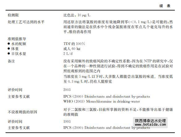 2)二氯胺和三氯胺 二氯胺和三氯胺沒有被廣泛研究,兩者現(xiàn)有的研究資料均不足以推導(dǎo)基于健康的準(zhǔn)則 值。不過,如果氯胺的含量沒有控制得當(dāng),這些化合物會造成水的味道與氣味問題(詳見第 10章)。