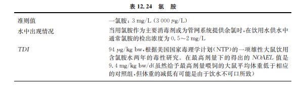一氯胺、二氯胺和三氯胺是飲用水加氯消毒的副產(chǎn)物(見表12.24),在水中加入氯和氨 時可形成上述物質(zhì)。在飲用水管網(wǎng)系統(tǒng)中加入一氯胺可保持殘留的消毒活性。由于多氯胺 的形成不規(guī)律,而且相同濃度下一氯胺導(dǎo)致的味道和氣味問題較多氯胺嚴(yán)重,故只考慮設(shè)立 一氯胺基于健康的準(zhǔn)則值。氯胺在胃中受胃液作用迅速分解。使用氯胺代替氯消毒可減少 在飲用水供應(yīng)中三鹵甲烷的形成。不過,有研究顯示添加氯胺會形成其他副產(chǎn)品,如鹵代 酮、三氯硝基甲烷、氯化氰、鹵乙酸、鹵代乙腈、醛類及氯酚。一氯胺是氯胺的主要成分,公認(rèn) 消毒效果比自由氯差,常在二次消毒中用來保持管網(wǎng)系統(tǒng)的余氯。