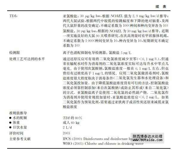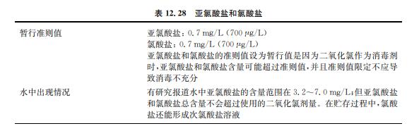 亞氯酸鹽和氯酸鹽是使用二氧化氯作為消毒劑或用于去除水中嗅味和異味的副產(chǎn)物 (見表12.28)。二氧化氯同時(shí)也用作纖維、紙漿、面粉和油類的漂白劑。亞氯酸鈉和氯酸鈉 用于制備二氧化氯以及其他商業(yè)用途。飲用水出水中,二氧化氯迅速分解成亞氯酸鹽、氯酸 鹽和氯化物離子,其中亞氯酸鹽是主要成分,該反應(yīng)在堿性條件下容易進(jìn)行。飲用水是接觸 環(huán)境中二氧化氯、亞氯酸鈉和氯酸鈉的主要途徑。氯酸鹽也會(huì)在儲(chǔ)存很久的次氯酸鈉溶液 中生成,特別是在高溫環(huán)境下。