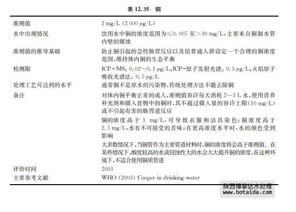 銅既是基本營(yíng)養(yǎng)元素,又是飲用水的污染物(見表12.35)。銅可用于制造管件、閥門和 配件,還可用于合成合金和鍍層。五水硫酸銅化合物有時(shí)會(huì)用于地表水中的藻類控制。飲 用水中銅的濃度范圍很廣。大多數(shù)情況,其主要來(lái)自銅制水管內(nèi)部的腐蝕。不過(guò)不斷流動(dòng) 的水或有壓流的水中銅的濃度往往較低。反之,在靜止的水或部分流動(dòng)水中銅的濃度變化 很大,最高濃度較高(經(jīng)常高于1mg/L)。在水輸送過(guò)程中,特別是輸水系統(tǒng)中處理過(guò)的水 呈酸性或含高濃度碳酸鹽而呈堿性的水中,往往會(huì)使銅的溶解增加,濃度升高。發(fā)達(dá)國(guó)家中, 食物和水是銅的主要暴露源。在使用裝有銅水管或接頭的管網(wǎng)系統(tǒng)中,水流經(jīng)常靜止或部分 流動(dòng)條件下,可以大大增加每日銅的攝入量,特別是嬰兒人工喂奶時(shí)用自來(lái)水調(diào)配的奶。