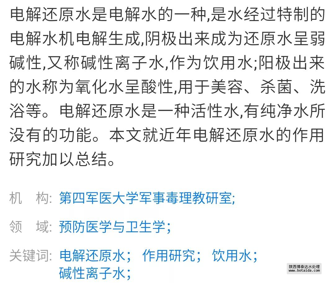 通常情況下,電解還原水是由普通的自來凈化水,然后通過陰陽電極,在電場的作用下將水分子團打散、變小、重新排列,使水分子的結構發(fā)生改變,使其中一部分水的氧化還原電位呈正值,另一部分水的氧化還原電位呈負值,最后通過膜分離技術得到電解還原水,使之具有醫(yī)療保健作用.