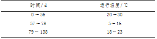 反應(yīng)器每天運行 4 個周期,每個周期 6 h,分為: 進(jìn)水 10 min,厭氧 80 min,好氧 210 min,沉淀 ( 30 ~ 3) min( 沉淀時間在顆粒培養(yǎng)階段逐漸由 30min 遞減至 3 min,顆粒成熟之后保持 3 min) ,排水 10 min,剩余時間閑置,反應(yīng)器換水比為 75% . 運行過程中對 pH 不做控制,控制曝氣流量為 1. 50L·min - 1 ,運行溫度變化如表 1 所示.