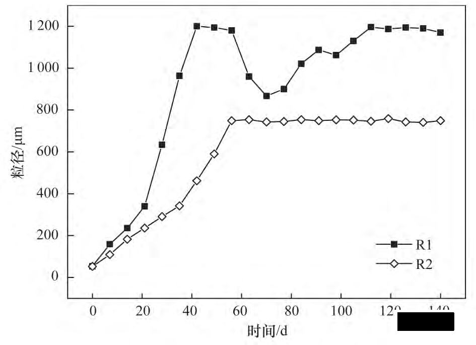R1、R2 分別以人工配水和實際生活污水為進(jìn)水,接種污水處理廠普通絮狀活性污泥,采取逐漸縮短沉淀時間的方式培養(yǎng)好氧顆粒污泥. R1、R2分別在第 20 d、35 d 時,出現(xiàn)細(xì)小顆粒,如圖 2 所示,分別歷時 25 d、42 d 后,顆粒污泥的平均粒徑達(dá)到 340 μm,好氧顆粒污泥工藝啟動成功. 顆粒污泥穩(wěn)定后,其平均粒徑分別達(dá)到1 200 μm、750μm. 有研究表明進(jìn)水有機(jī)負(fù)荷是好氧顆粒污泥形成的重要影響因素,有機(jī)負(fù)荷較低,微生物生長速率減慢,不利于顆?;? 人工配水中的有機(jī)物易被微生物吸收利用,而實際生活污水水質(zhì)成分復(fù)雜,由易生物降解物質(zhì)、慢速生物降解物質(zhì)和溶解性惰性物質(zhì)組成,其中,溶解性惰性物質(zhì)包含不可生物降解的 COD 組分,生活污水中能被微生物利用的有機(jī)負(fù)荷較人工配水少,故 R2 相對R1 污