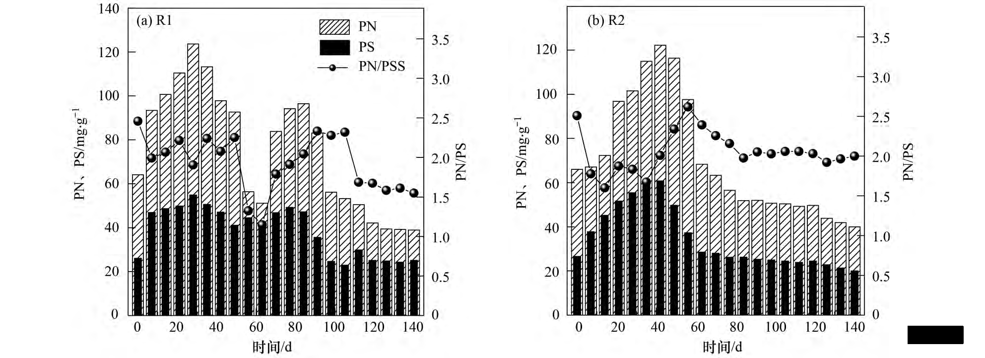 胞外聚合物( EPS) 主要由蛋白質(zhì)( PN) 和多糖 ( PS) 組成,在污泥顆?;^程中具有重要作 用. 如圖4 所示,PN、PS 在顆粒污泥啟動階段 ( 0 ~ 25 d 和 0 ~ 42 d) 整體呈上升趨勢,R1、R2 內(nèi)的 PN 含量( 以 MLSS 計) 分別由初始的 64. 12mg·g - 1 、65. 98 mg·g - 1 增 加 到 最 大 值 123. 65mg·g - 1 、122. 19 mg·g - 1 ,PS 含量分別由初始的26. 08 mg·g - 1 、26. 59 mg·g - 1 增加到最大值 64. 89mg·g - 1 、62. 13 mg·g - 1 . PS 越高,污泥表面親水性越強(qiáng),PN 增加,污泥疏水性增強(qiáng),細(xì)菌之間的黏附性能也隨之增加,有利于顆粒污泥的形成. R1 中微生物可利用的有機(jī)負(fù)荷較高,刺激微生物產(chǎn)生更多的EPS,故顆粒形成時間較短. 在實驗進(jìn)行的第 57 ~ 78 d,由于室內(nèi)溫度較低( 5 ~ 16℃ ) ,R1 中PN 含量減少至 51. 15 mg·g - 1 ,細(xì)胞表面的疏水性減弱,不利于微生物相互黏附,顆粒解體,而生活污水中含有一定的蛋白質(zhì),與顆粒污泥接觸時可被絮凝吸附,故 R2 中PN 含量受溫度影響較小.