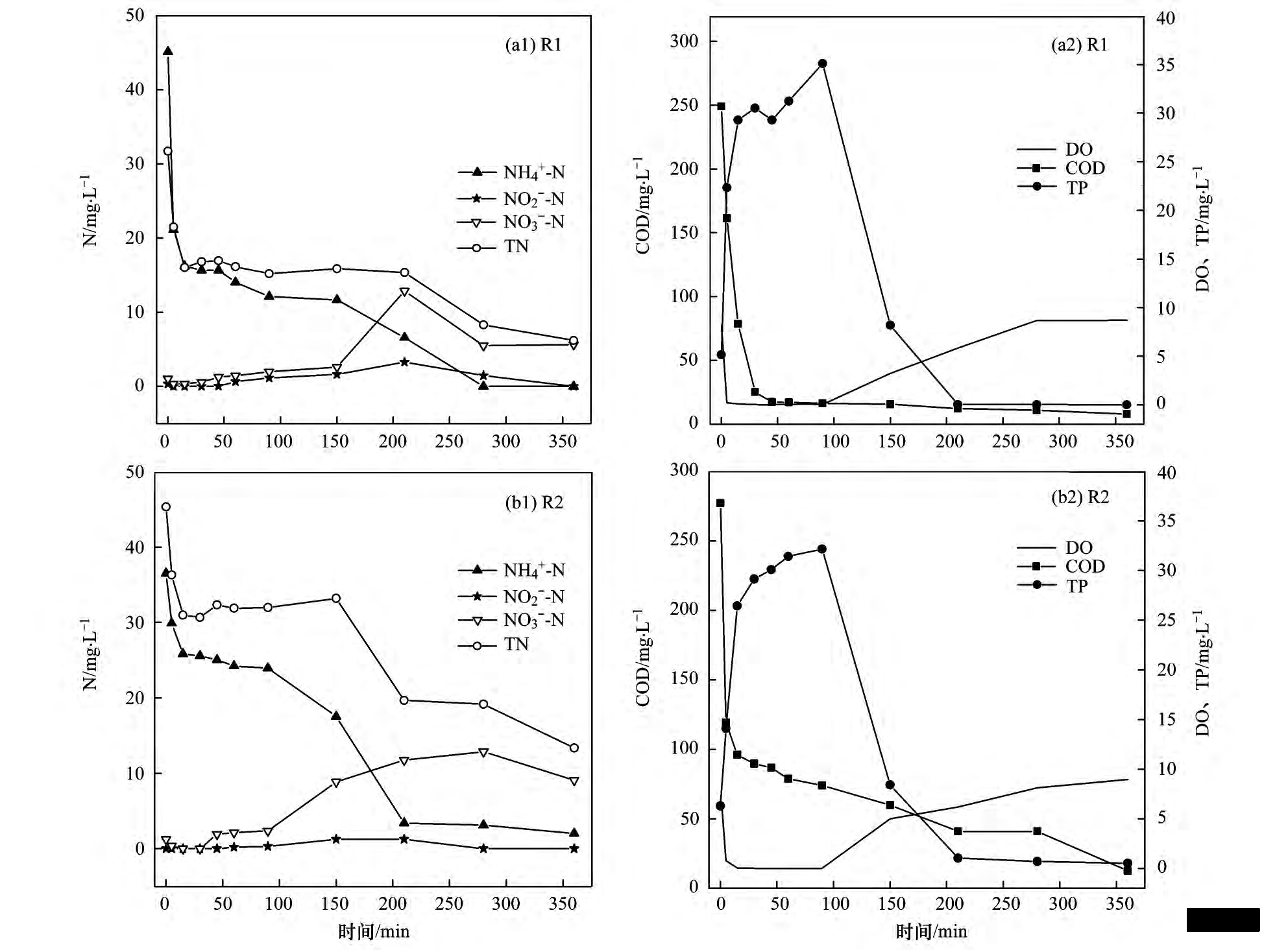 圖 6 為 R1、R2 在第 128 d 的一個典型周期內(nèi)NH + -N、NO - -N、NO - -N、TN、COD、TP、溶解氧4 2 3( DO) 的濃度變化. 厭氧階段,R1、R2 反應(yīng)器內(nèi)的DO 濃度在 0. 02 mg·L - 1 以下,好氧階段,R1、R2中 DO 緩慢增加,最終穩(wěn)定在 8 mg·L - 1 左右,反應(yīng)器內(nèi)具有良好的 A/ O 運行環(huán)境. R1 中 COD 濃度在厭氧階段下降較快,在前 30 min 已經(jīng)基本消耗,COD 由 250 mg·L - 1 降至 25. 12 mg·L - 1 . R2 反應(yīng)器進(jìn)水為生活污水,在厭氧階段,由于有機(jī)物成分復(fù)雜,微生物可快速利用的有機(jī)碳源較少,所以降解速度較慢, COD 由 275. 19 mg·L - 1 降至 90. 44mg·L - 1 ; 在好氧階段,反硝化作用消耗有機(jī)碳源,COD 濃度逐漸降低至 24. 58 mg·L - 1 ,COD 得到去除. 在厭氧末期,R1 釋磷較多,反應(yīng)器內(nèi)的 TP 濃度為 35. 09 mg·L - 1 ,而 R2 反應(yīng)器內(nèi)的 TP 濃度為32. 18 mg·L - 1 . 導(dǎo)致釋磷量不同的主要原因為生活污水中含有慢速生物降解物質(zhì)和溶解性惰性物質(zhì)等不利于聚磷菌利用的有機(jī)物,在厭氧階段不能夠完全降解,降低了釋磷量. 在周期實驗出水中,R1、R2 出水均未檢測到NH + -N、NO - -N,出水NO - -N濃度分別為 5. 65 mg·L - 1 、9. 67 mg·L - 1 ,產(chǎn)生這種現(xiàn)象的原因為,穩(wěn)定運行時,R1 中顆粒污泥粒徑較R2 大,由于好氧顆粒污泥內(nèi)部存在一個“缺氧區(qū)”,粒徑越大,顆粒污泥內(nèi)部的缺氧區(qū)越大,這為反硝化菌提供了良好的生存環(huán)境,提高了反硝化能力,因此 R1 反應(yīng)器內(nèi)NO - -N的出水效果更好.