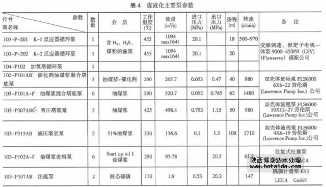 表4列出了煤液化主要泵參數(shù),這些泵當時都是從國外進口的,現(xiàn)在有些已能國產(chǎn),但還是有不少位號的泵需要通過技術(shù)攻關(guān)才能實現(xiàn)國產(chǎn)化。