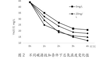 如圖2表示,葡萄糖作為外加碳源,在投加量分別為0、20mg/L、40mg/L和80mg/L情況下,總氮隨時(shí)間的變化值。總氮隨反應(yīng)時(shí)間的延長,濃度逐漸降低,最終出水濃度分別為21mg/L、18mg/L、15mg/L和12mg/L。在投加碳源后,系統(tǒng)對脫氮的效果有所提升,對總氮的去除率分別為52%、59%、66%和73%。投加碳源達(dá)到20mg/L后出水滿足《城鎮(zhèn)污水處理廠污染物排放標(biāo)準(zhǔn)》GB18918-2002中的一級B標(biāo)準(zhǔn),而且隨著投加量的增加,系統(tǒng)對總氮的處理效果增強(qiáng)。實(shí)驗(yàn)表明:碳源的投加,保證了硝化細(xì)菌,特別是異養(yǎng)型反硝化細(xì)菌對碳源的需求,提高的脫氮的效果。